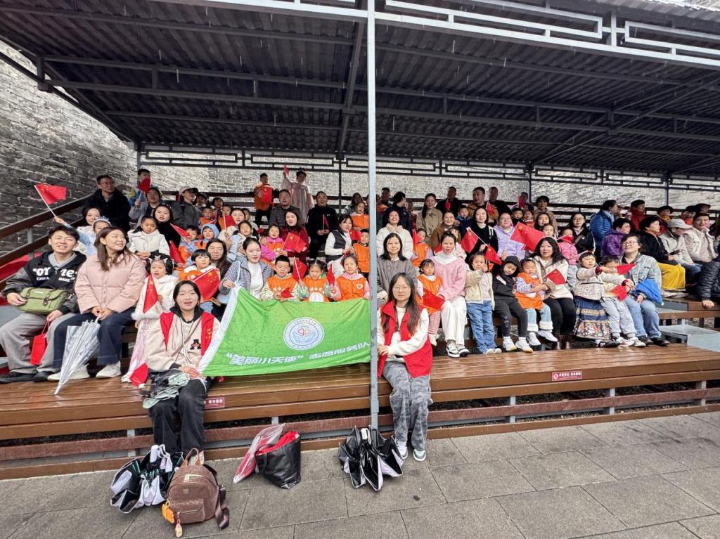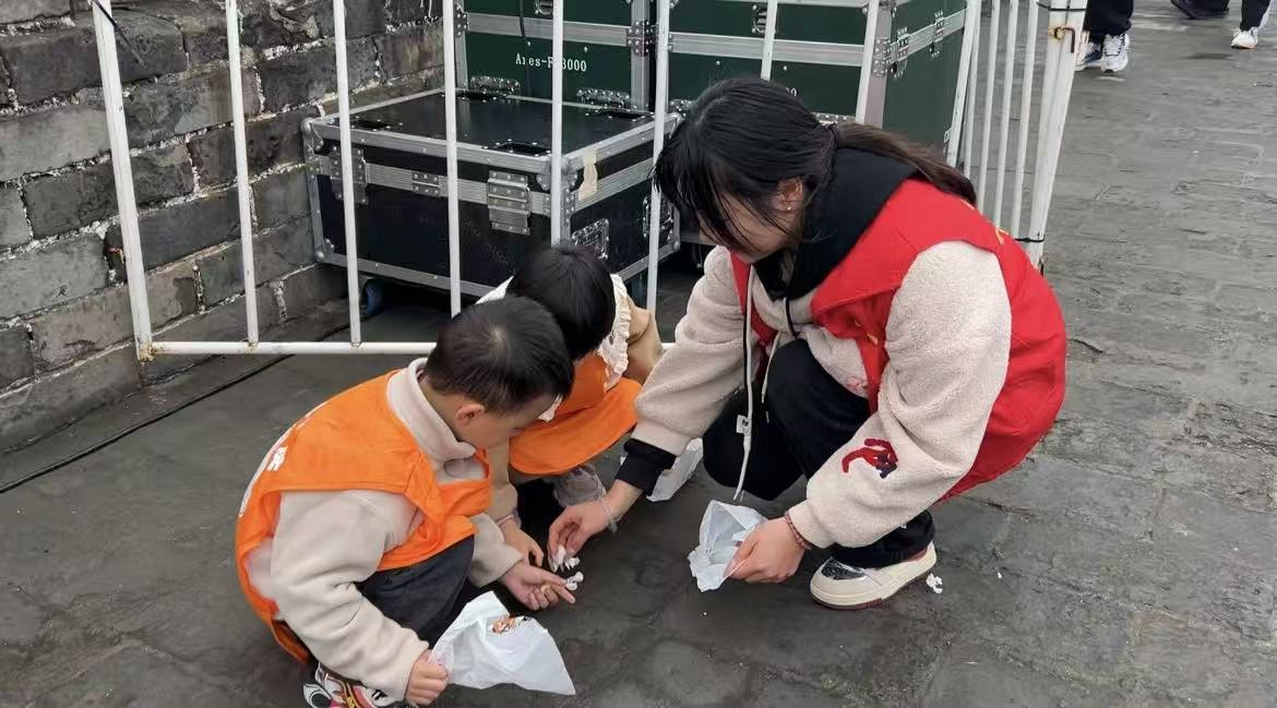 手工活动后,志愿者带领亲子家庭走进宾阳楼景区,手持垃圾袋和清洁工具,共同捡拾纸屑、烟头、塑料瓶等垃圾。孩子们在劳动中体会到环保的意义,家长也以身作则,树立了爱护环境的榜样。
