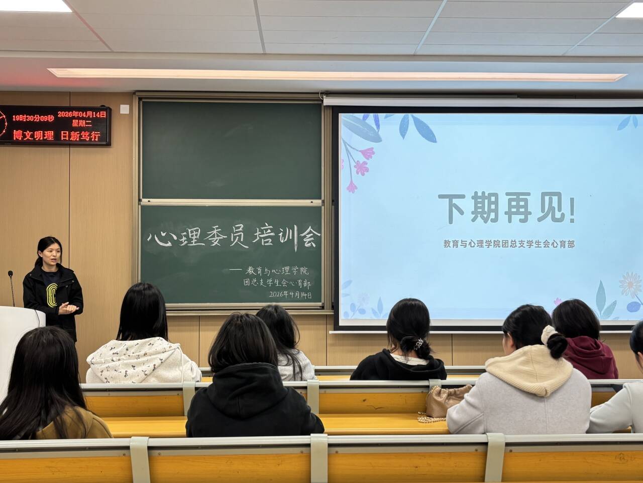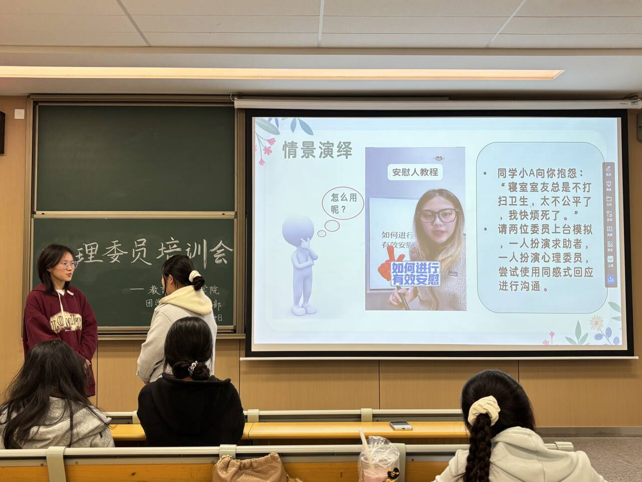 本网讯(通讯员 俞佳蓓)为健全公司心理健康教育工作体系,提升心理委员朋辈帮扶专业能力与综合素养,4月14日19:00,公司在教学楼A-410圆满举行第一期以人际关系为主题的心理委员专项培训。培训由教育与心理公司团总支员工会心育部部长王婧娴主持,辅导员李晓怡、心育部全体成员及各班心理委员参会。
