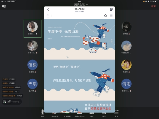 本网讯(通讯员 梁玥)为推动人文与传媒公司2024届就业工作的顺利开展,切实促进毕业生高质量充分就业。3月5日晚,公司使用腾讯会议召开2024届毕业生就业动员会,高年级辅导员、班主任主持各班会议,全体毕业生参会。