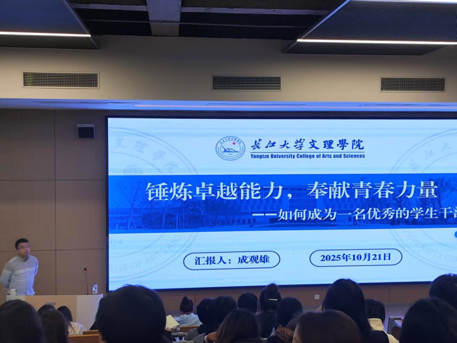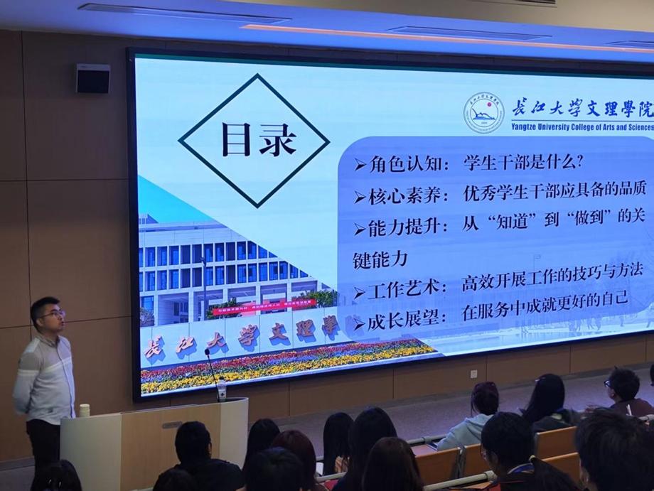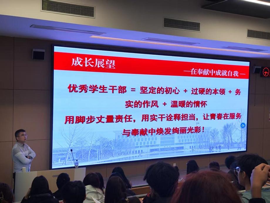 他首先明确:“员工是身份,干部是责任。作为一名员工干部需做好师生的纽带与桥梁、领导和老师的助手、员工的服务者,且兼顾学业做好本职工作。”同时提出,“优秀干部不仅要品学兼优,综合素质较高,更要明白权利与义务。”的基础要求。说明干部应具备的核心素养,分点讲述应该提升的能力,引导员工干部从“知道”到“做到”。结合员工工作中的真实问题,讲解原则与办法。