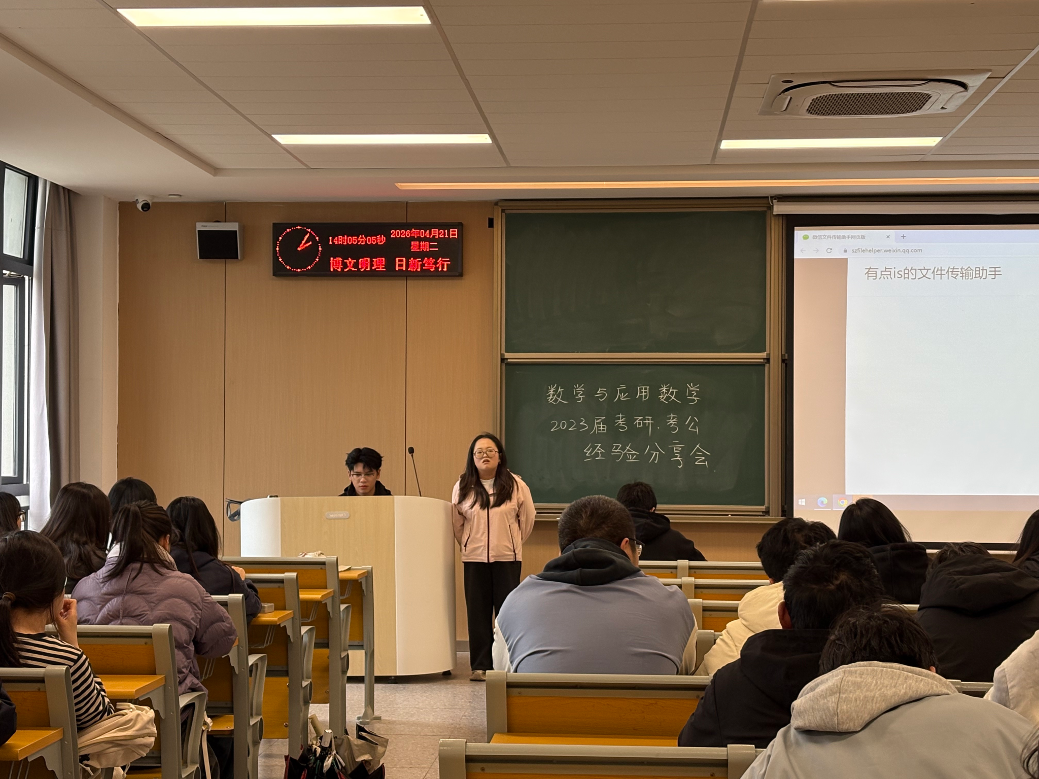 为帮助同学们明晰考研、考公考编备考方向,掌握科学备考方法,合理规划学业与职业发展道路,数学与医护系于4月21日14:00开展考研考公经验分享会。本次活动特邀向宝蓉和王宏坤两位优秀员工,为在场学子带来干货满满的经验分享,学子们收获颇丰。