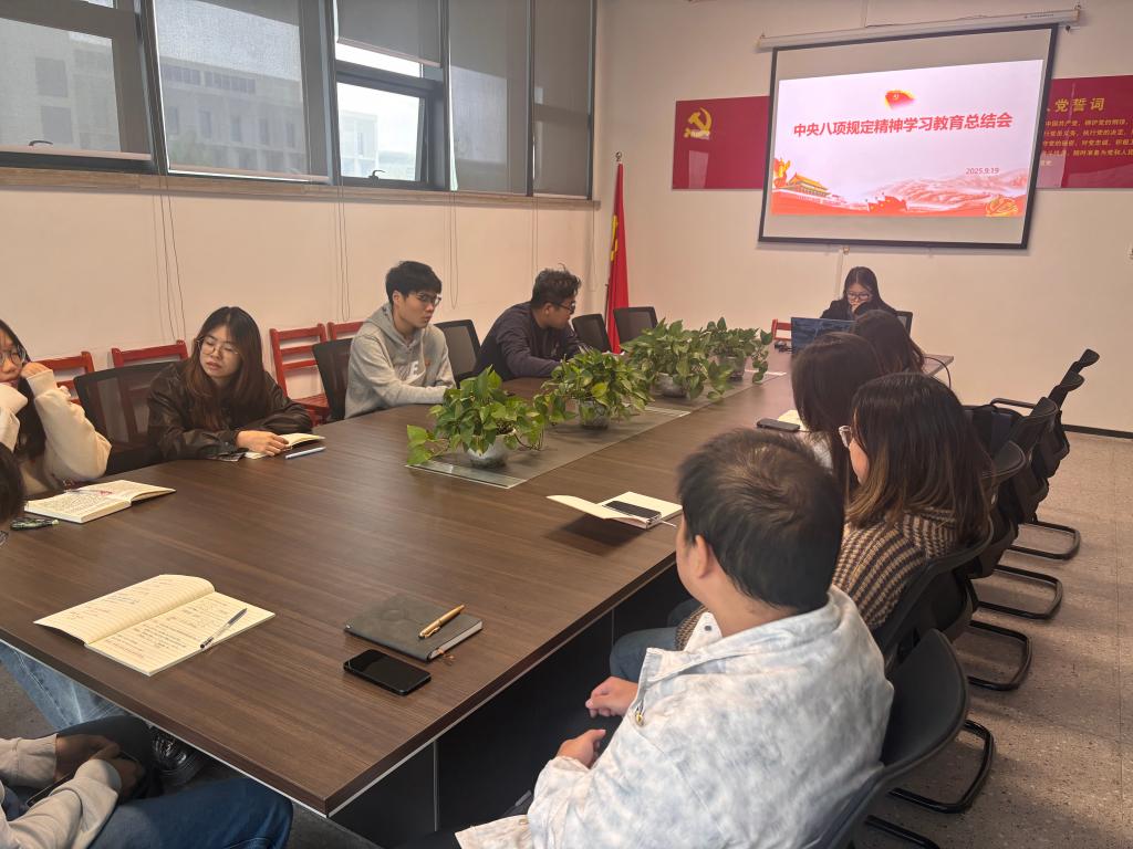 接下来,支部召开了中央八项规定精神学习教育总结会。自中央八项规定精神学习教育启动以来,我支部严格按照上级部署要求,精心组织、扎实推进,通过集中学习、个人自学等多种形式,组织全体党员深入学习《习近平关于加强党的作风建设论述摘编》和中央八项规定及其实施细则精神。通过学习,全体党员的思想认识显著提高,对中央八项规定精神的重要性和紧迫性有了更深刻的理解,进一步筑牢了贯彻落实的思想根基。会上,员工党员代表结合自身学习与实践经历作交流发言,阮佳莹同志谈到:“通过学习,我深刻认识到中央八项规定不仅是对党员干部的要求,更是对青年党员的行为准则。作为员工党员,我们要从‘节约一粒粮、杜绝一次学术不端、拒绝一次铺张浪费’做起,把作风建设融入日常学习生活。”