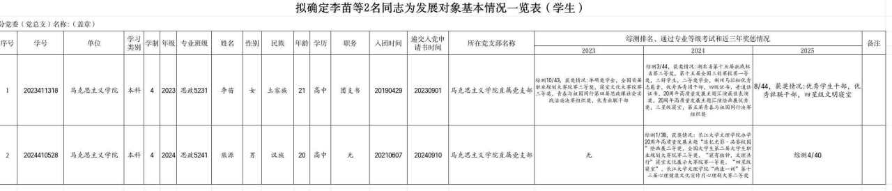 附:拟确定熊源等2名同志为发展对象基本情况一览表