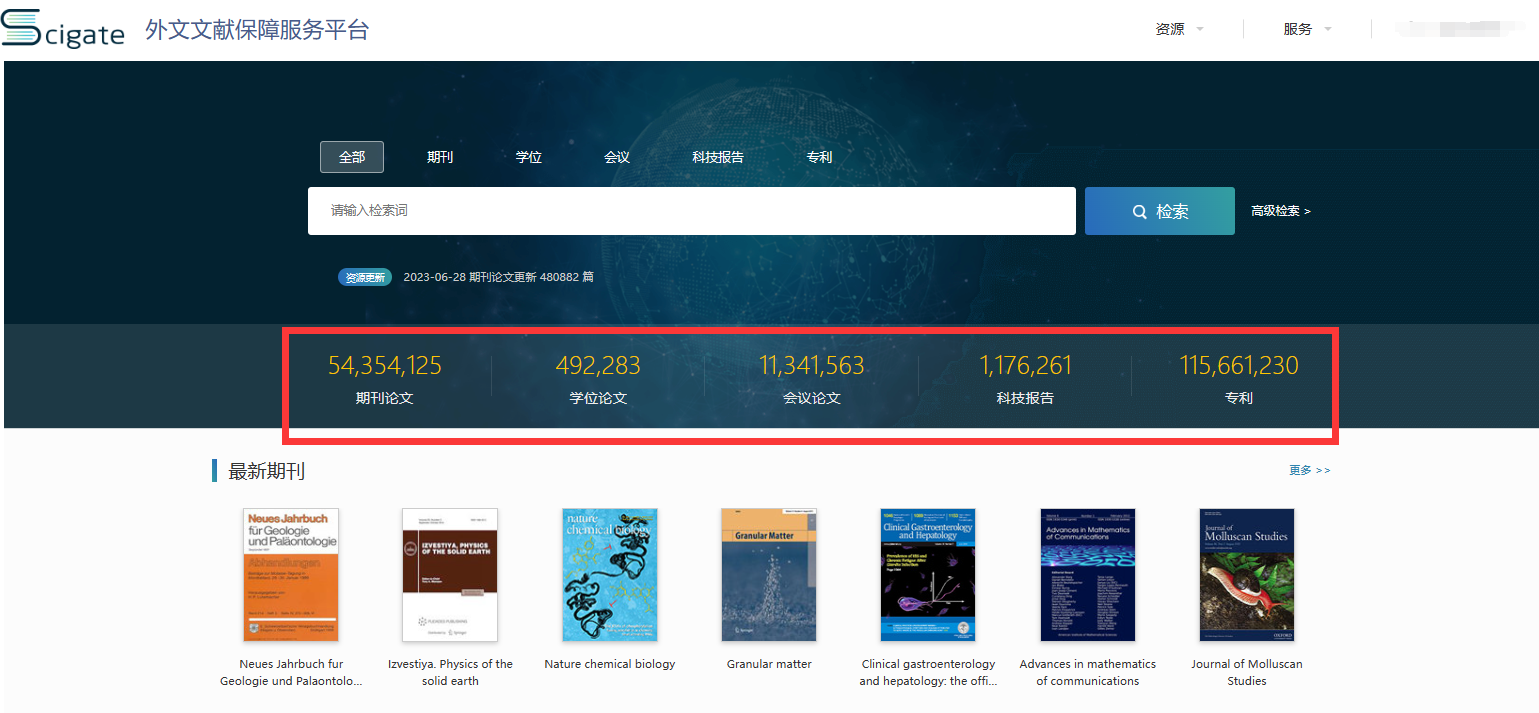 开通服务内容:外文文献保障平台以大数据环境下的知识发现技术为基础,整合、关联、挖掘数亿条全球优质外文学术资源,旨在切实提升全球科技文献资源的可发现度、可及性与可利用率,协助用户最大限度地组织文献资源为教学和科研服务;资源涵盖自然科学、工程技术、医药卫生、农业科学、哲学政法、社会科学、科教文艺等多个学科。