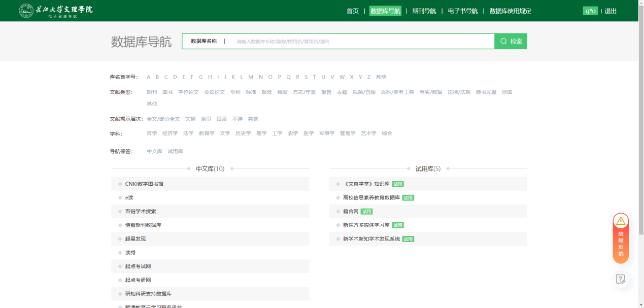 同时提供数据库分面过滤,支持按首字母A-Z、文献类型、学科分类检索,快速筛选出所需数据库,满足读者不同的搜索习惯。