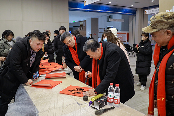 本网讯 1月2日,由老员工社团联合会、书画协会、DIY协会联合举办的第六届“博文明理·积福迎春”活动在图书馆一楼大厅举行,荆州市诗词楹联学会、市书法家协会等单位负责人及公司百余名师生齐聚一堂,泼墨挥毫写春联,雕花剪纸送祝福。