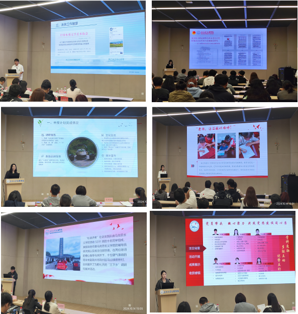 来自各教学单位的11个“三下乡”“返家乡”实践团参与答辩,答辩人根据抽签顺序,围绕申报计划完成情况、展示内容、实践成果等方面进行汇报。汇报类型包含习近平新时代中国特色社会主义思想宣传团、爱国主义教育实践团、中华文化传承团、科技创新实践团、乡村振兴促进团、基层服务践行团等多个类别。