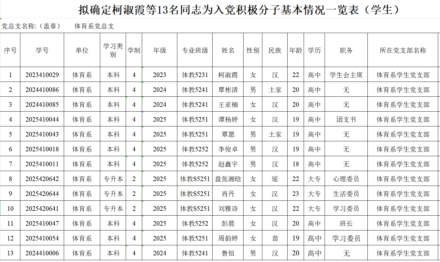 附:拟确定柯淑霞等13名同志为入党积极分子基本情况一览表