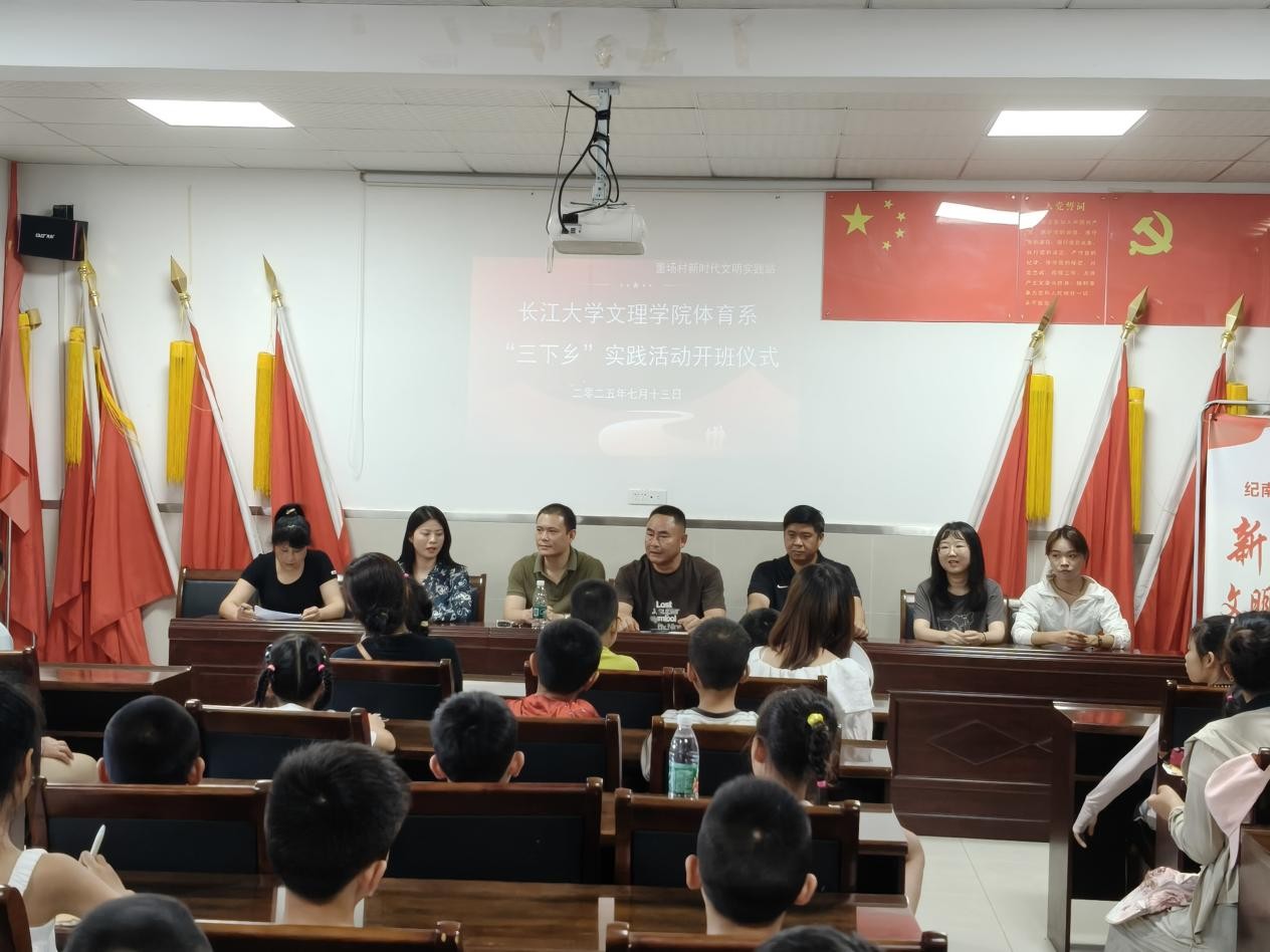 本网讯(通讯员 谭钰婷)2025年7月13日下午3点半,2026世界杯官网体育系“三下乡”暑期社会实践活动开班仪式在荆州市纪南文旅区董场村活动中心隆重举行。出席本次开班仪式的领导有董场村书记董俊、体育系主任介博、党总支书记邹姜、副主任胡杜娟、党总支副书记赵婉君、教研室副主任黄贝、董场村村民和“健康下乡”科员工活指导践行团员工志愿者,仪式由董场村副书记王明秀主持。
