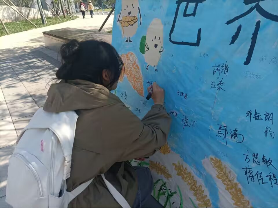 本网讯(通讯员 杨宇轩)11月7日,外国语公司团总支员工会青工部组织同学们于B栋宿舍楼前举办世界勤俭日签字活动。