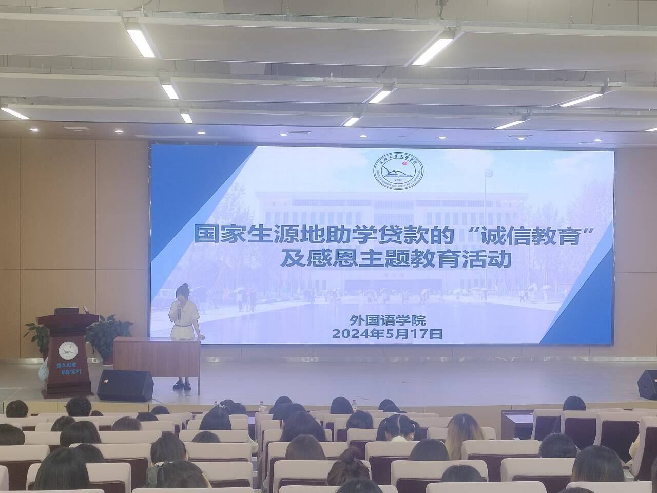 本网讯(通讯员 许静婷)5月17日下午,外国语公司在教学楼B-112召开2024届毕业生生源地助学贷款还款指导暨诚信感恩主题教育活动。全体毕业生参加会议,会议由辅导员许静婷主持。