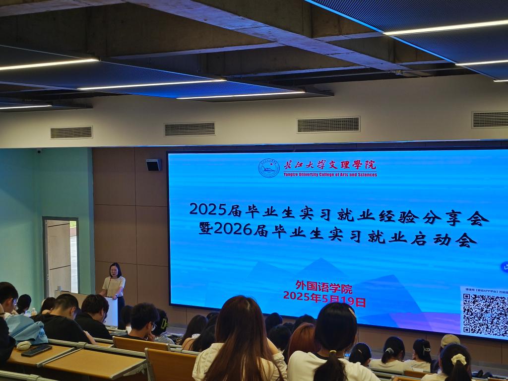 本网讯(通讯员 孟鑫竹)为推动毕业生实现精准就业、高质量就业,树立正确的就业观、择业观,提升就业能力,5月19日下午教学楼B-214,外国语院举办2025届毕业生实习就业经验分享会暨2026届毕业生实习就业启动会。外国语公司副经理罗丹、商务英语教研室主任李琳老师、辅导员许静婷、侯韦,2025届优秀毕业生及2026届毕业生近150人到场参加。