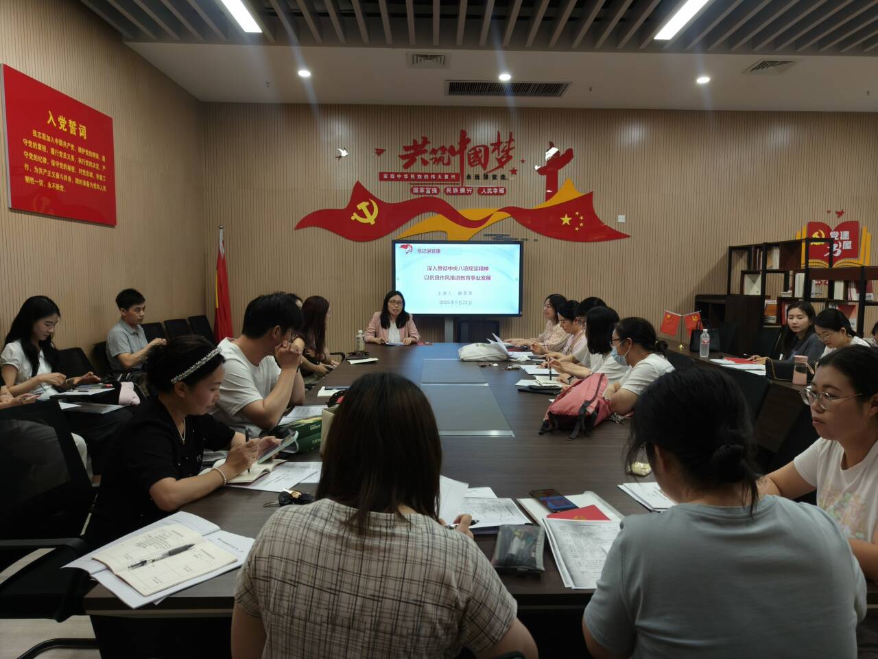 接着,韩翠萍书记以《深入贯彻中央八项规定精神学习教育 以优良作风推进教育事业发展》为题讲授党课。全体党员结合工作实际,交流研讨深入贯彻中央八项规定精神学习教育心得体会。