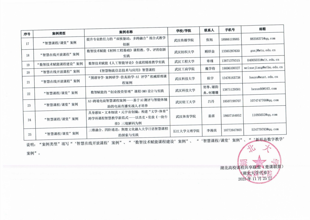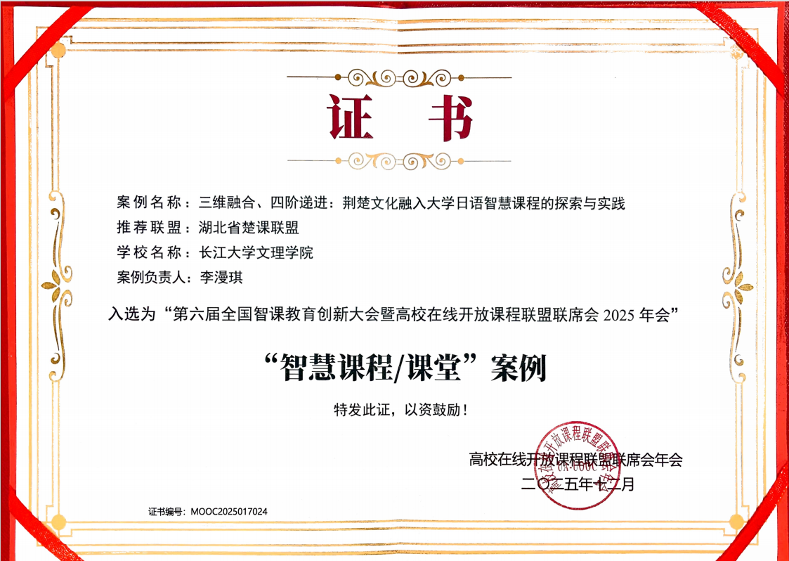 本次大会同期开展优秀课程案例遴选,经楚课联盟前期推荐、全国大会专家评审,湖北省共17所高校的25个案例脱颖而出。李漫琪主持的《大学日语》依托超星智慧教学平台重构课程内容,打造“荆楚文化+智慧日语”的个性化路径:以“荆楚文化对日传播”为主线,构建“日语知识—文化传播—思政育人”三图谱融合的数字化内容体系,通过智慧工具实现个性化学习路径,形成“感知・理解・表达・传播”四阶递进育人生态,推动员工从“沉默学习者”转变为“文化传播者”。