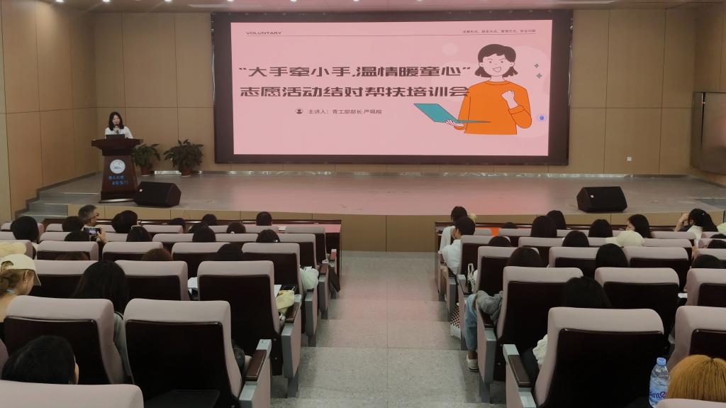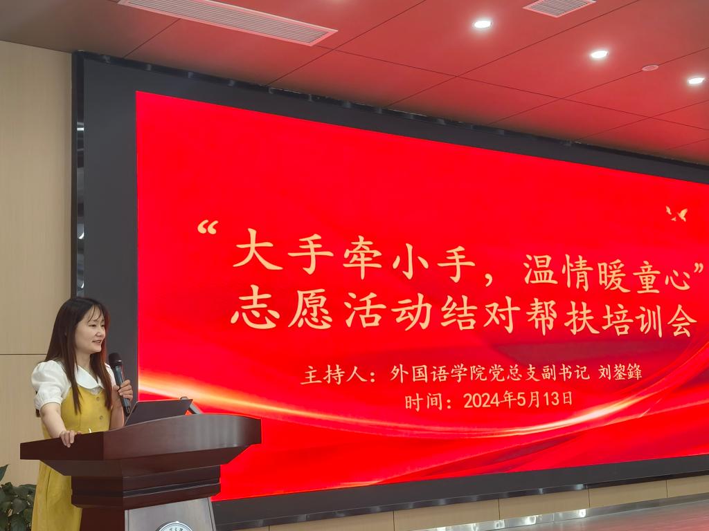 本网讯(通讯员 杨飞燕)5月13日,外国语公司展开了“大手牵小手,温情暖童心”志愿活动结对帮扶培训会。会议由外国语公司党总支副书记刘鋆锋主持。