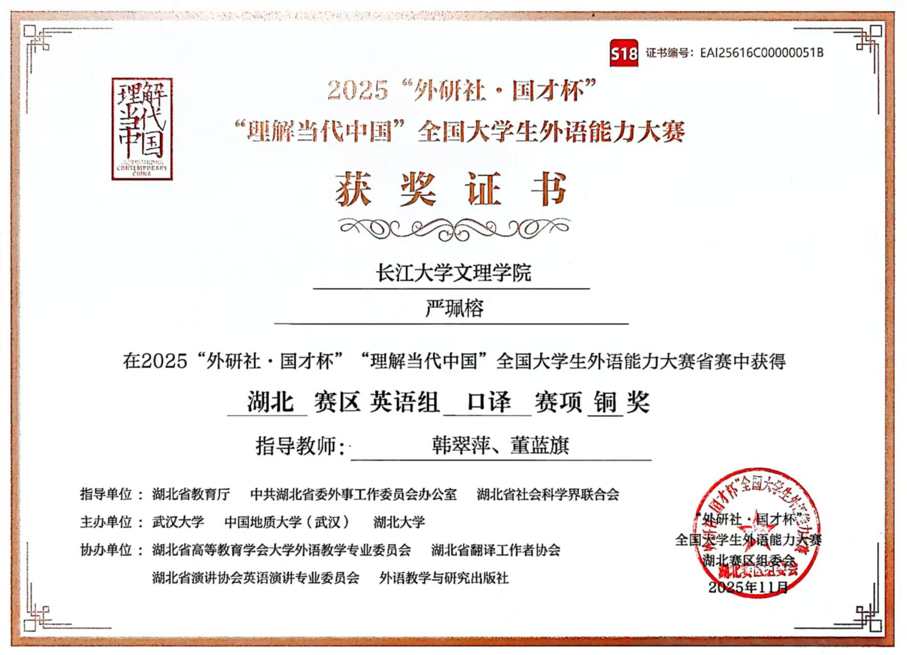本次大赛由湖北省教育厅、中共湖北省委外事工作委员会办公室及湖北省社会科学界联合会联合指导,吸引了来自武汉大学、华中科技大学、华中师范大学等全省多所高等院校的精英学子同台竞技,赛事规格高、竞争激烈。经过紧张而严谨的评审角逐,岳敏娜、严珮榕两位同学凭借扎实的语言功底与良好的专业素养喜获佳绩,充分展现了公司外语人才培养的质量与成效。