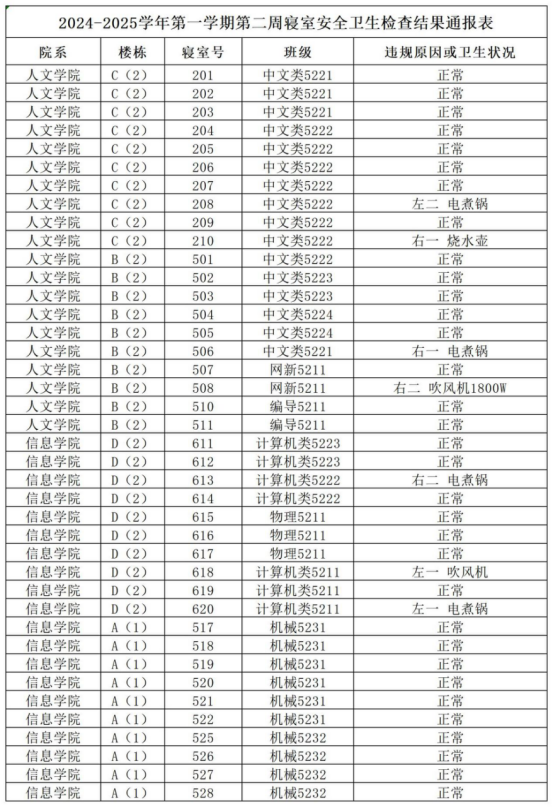 2024-2025学年第一学期第二周寝室安全卫生检查结果通报