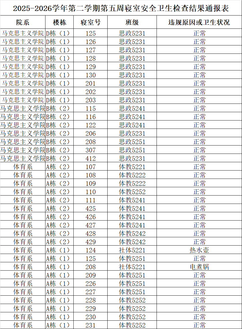 2025-2026学年第二学期第五周寝室安全卫生检查结果通报表