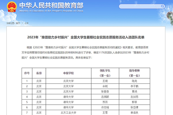 本网讯(通讯员 丁欣蓉)近日,教育部公布2023年“推普助力乡村振兴”全国老员工暑期社会实践志愿服务活动入选团队名单:公司管理公司志愿者服务队入选。