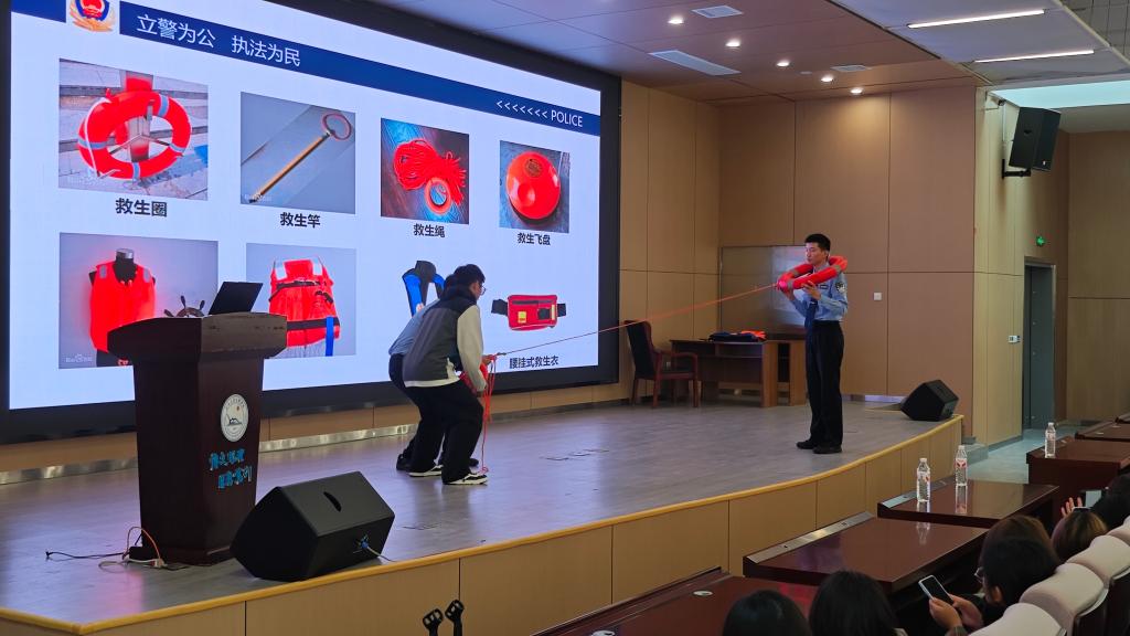 理论深入人心,实践更显真章。在气氛热烈的互动环节,苏毅哲警长邀请同学走上讲台,手把手教学救生衣的“正确打开方式”——从卡扣的清脆咬合声到松紧带的精准调节,每一个细节都关乎生死;救生圈的抛投示范更是扣人心弦,角度、力道、安全距离的把握,在模拟实战中变得清晰可循。同学们在亲身体验中,将知识转化为了守护生命的真实力量。