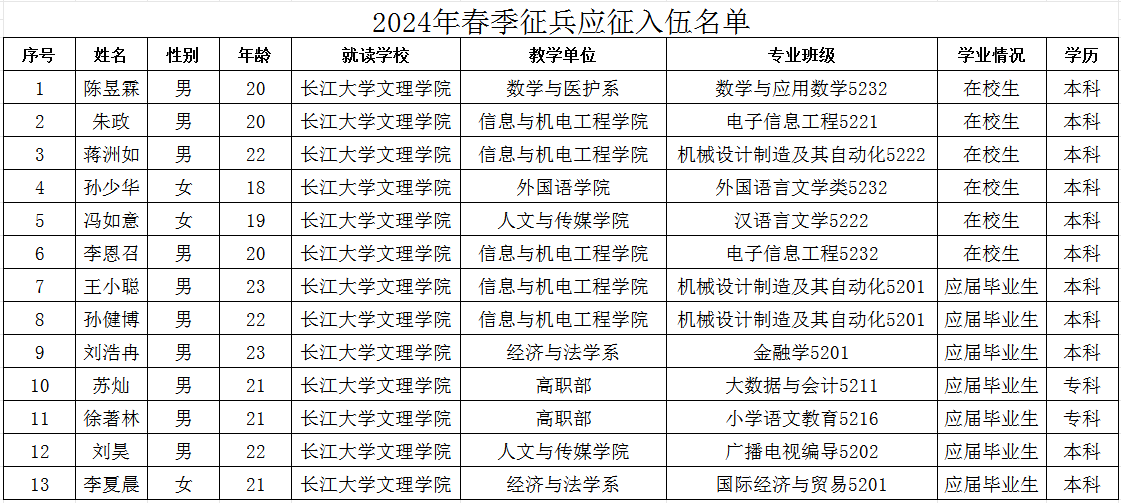 通过荆州区武装部组织的体检、政审考核、心理测试、役前训练等环节,我校陈昱霖等13名同学经湖北省荆州市荆州区人民政府征兵办公室批准光荣入伍,现根据相关规定予以公示,公示时间为2024年3月20日至3月25日。如有异议,请在公示期内向公司纪检监察部或荆州区武装部进行反映。