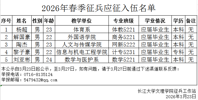 通过荆州区人民武装部组织的体检、政审考核、役前适应性测试、役前训练等环节,公司杨超等5名同学经湖北省荆州市荆州区人民政府征兵办公室批准光荣入伍,现根据相关规定予以公示,公示时间为2026年3月23日至3月27日。如有异议,请在公示期内向公司纪检监察部或荆州区人民武装部进行反映。