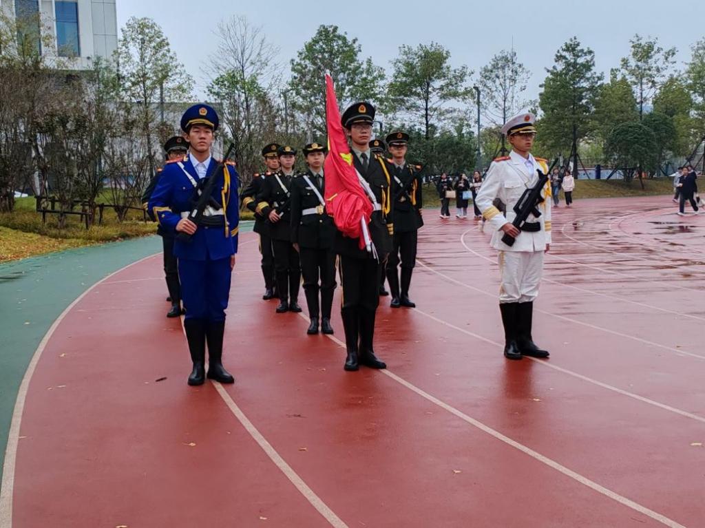 在细雨中,国旗护卫队的队员们踏着铿锵有力的步伐,庄严地护送着国旗迈向升旗台。随着雄壮激昂的国歌响起,五星红旗在晨光中缓缓升起,迎风飘扬。