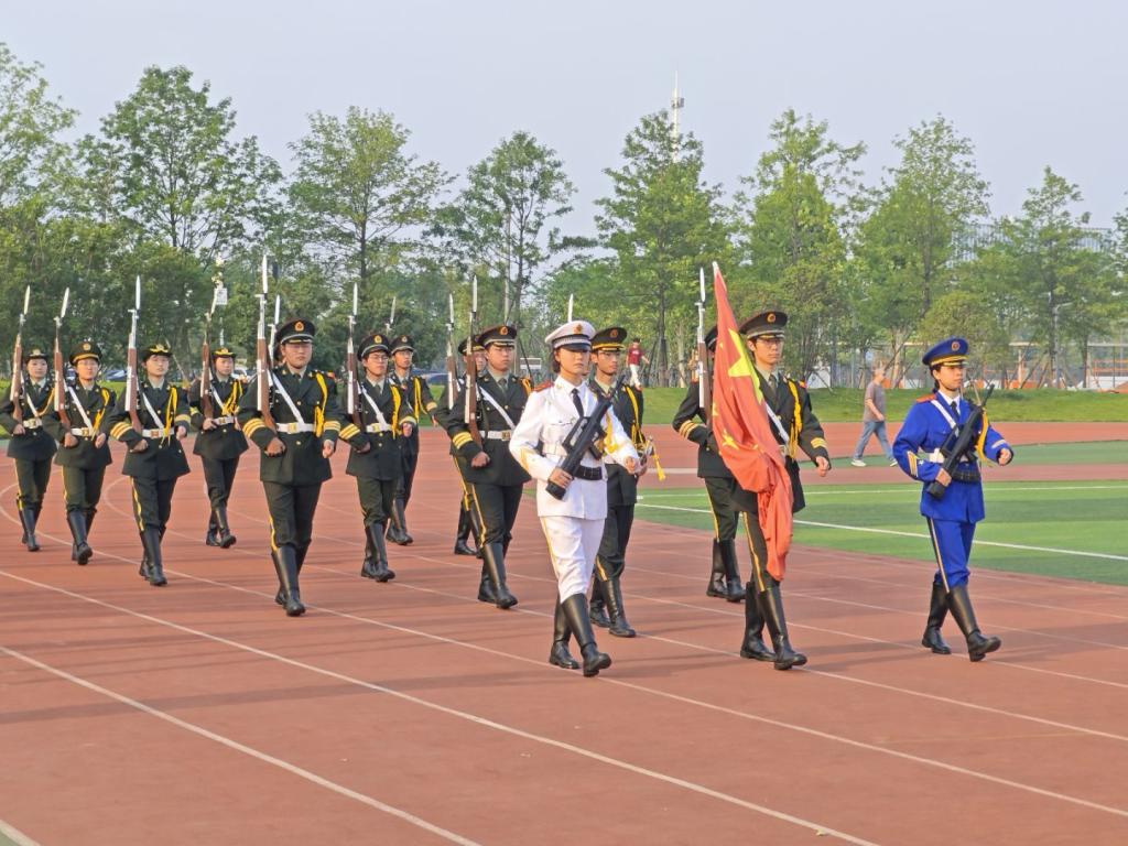 迎着东方升起的第一缕晨曦,国旗护卫队护送鲜艳的五星红旗至升旗台前。伴随着庄严的国歌声,五星红旗冉冉升起,全体师生肃立,行注目礼。