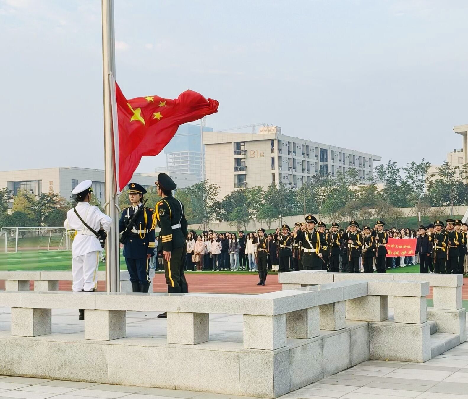 10月27日清晨,为深入学习贯彻党的二十届四中全会精神,厚植师生家国情怀,强化使命担当,经济与法学系在操场隆重举行“盛会启新程,赤心向国旗”主题升旗仪式。全体教职工和在校员工整齐列队,庄严肃立,共同参与了这一庄严的爱国主义教育活动。仪式由法学5245班林雪月同学主持。