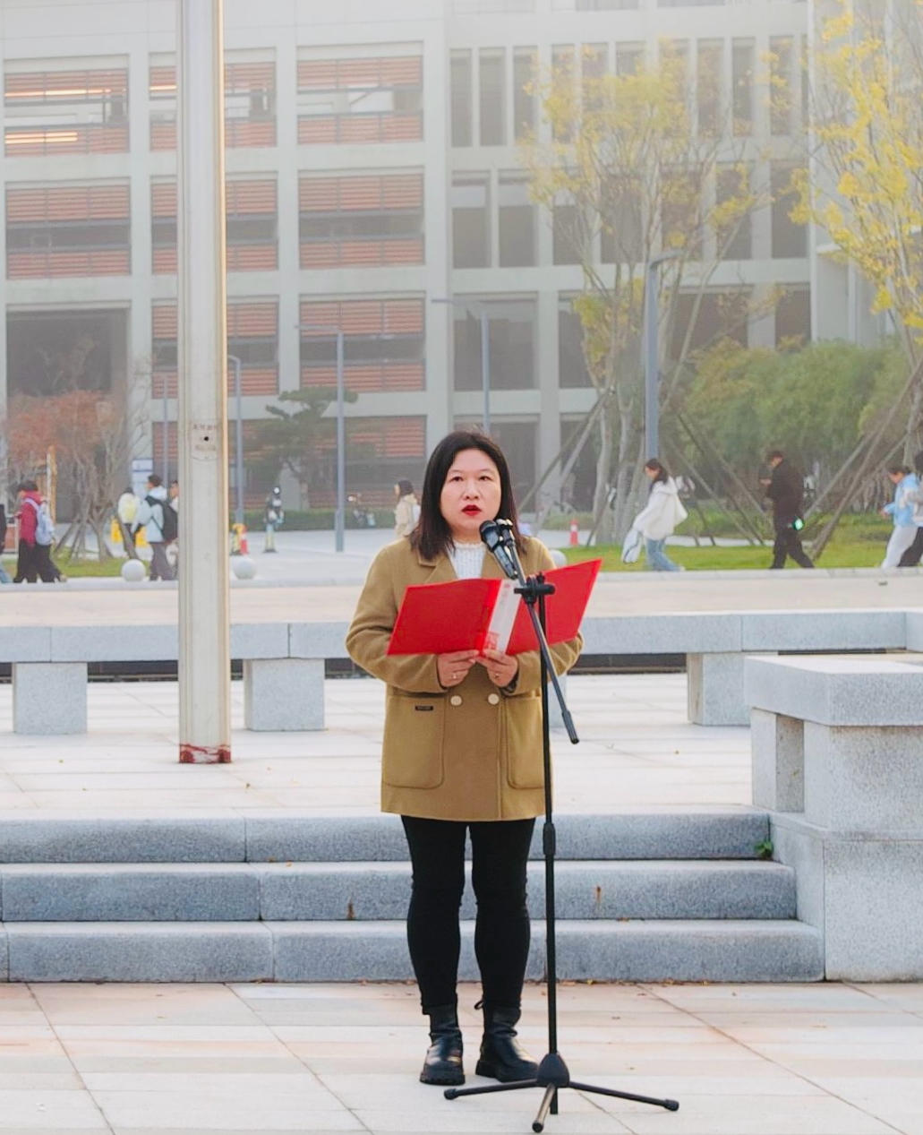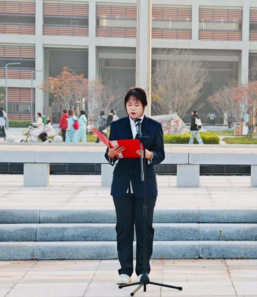 经济与法学系志愿者服务队队长徐廷婷作为员工代表发言。她围绕党的二十届四中全会精神,号召青年学子从国家发展大局中找准自身专业定位,以实干担当践行青春使命,将个人理想融入中国式现代化的伟大实践。