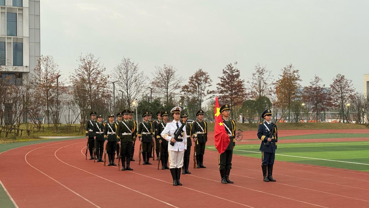 升旗仪式正式开始。国旗护卫队队员身着仪仗队队服,迈着铿锵有力的步伐,护卫着五星红旗走向升旗台。伴随着雄壮的《义勇军进行曲》,五星红旗缓缓升起,全体师生肃立注目。