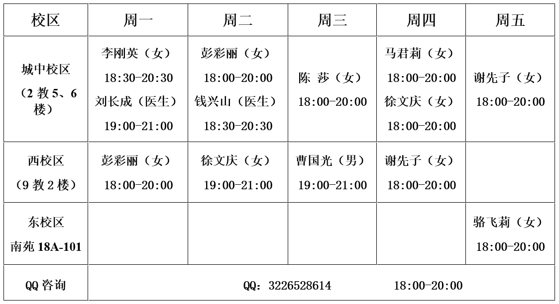 2)电话咨询:城中-8068012;西校区-8066850;东校区-8068012(表中值班时间段均可拨打)
