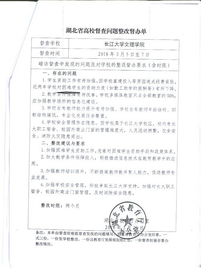 2018春季湖北省高校督查问题整改督办单